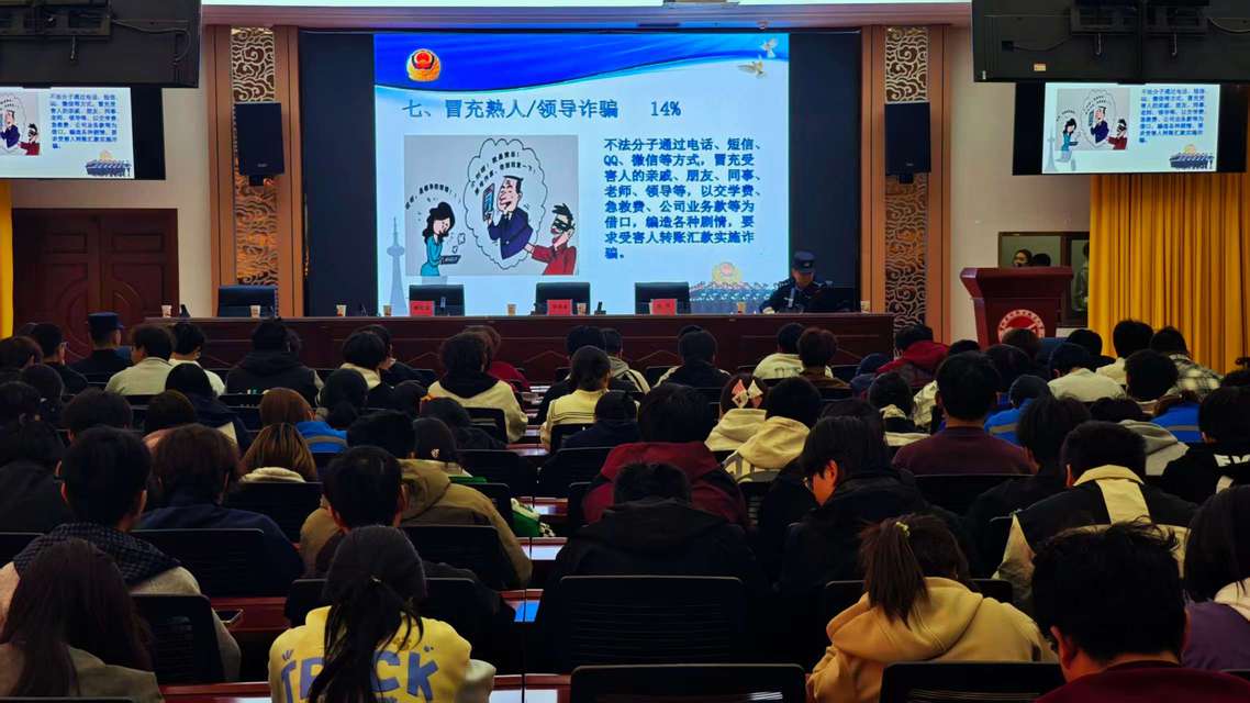 为进一步筑牢校园安全防线,提升同学们的反诈防骗意识与自我保护能力,3月31日,古天乐代言太阳集团邀请先锋路派出所民警在西固东校区多功能报告厅开展“主动创稳 积极防范网络诈骗”安全法治警示教育活动,24级、25级部分同学参加了教育大会。